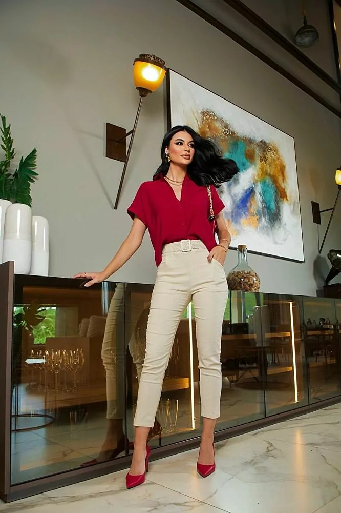 Calça Rebeca, confeccionada em tecido de algodão de alta qualidade. Este modelo destaca-se pelo detalhe do cinto trançado no cós, complementado por uma fivela forrada que agrega sofisticação. Além disso, a calça possui um bolso com um corte mais justo, conferindo um toque contemporâneo ao visual.