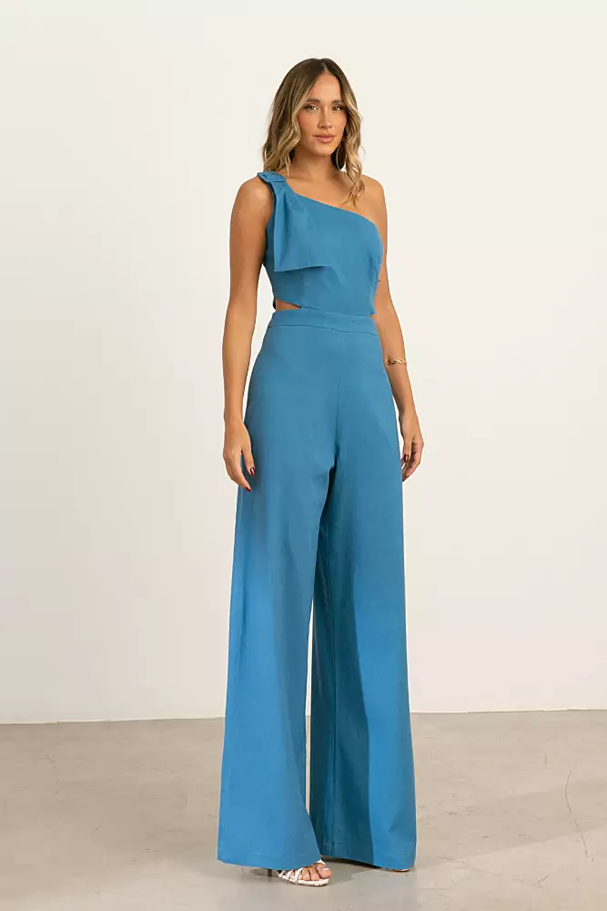 Macacão de manga única com detalhe de fivela no ombro, recortes laterais.